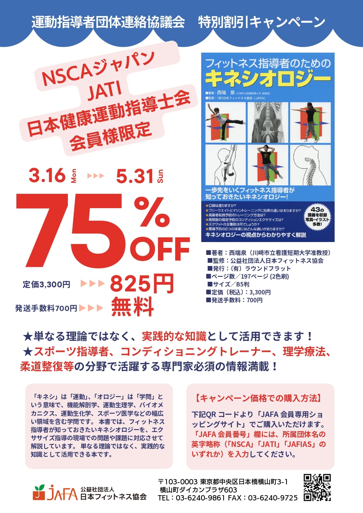 公益社団法人日本フィットネス協会からのお知らせ【JATI会員様へ特別割引キャンペーン】ロングセラー書籍『フィットネス指導者のためのキネシオロジー』を75%オフ&送料無料(JAFAより)